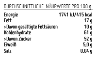 Zutaten & Allergene: Honig (50%), Kakaomasse, Zucker, Kakaobutter, Karamellzuckersirup VOLLMILCHPULVER. Glukosesirup, Invertzuckersirup, Kakaopulver, Emulgator (SOJALECITHINE), Kaffeeextraktpulver (0,15), Alkohol (0,1%), Wasser, Konzentrate (Kürbis,Karotte), natürliches Aroma, Säuerungsmittel (Citronensäure), natürliches Vanillearoma. Kann Bestandteile von ERDNÜSSEN, WEIZEN, EI, MILCH und SCHALENFRÜCHTEN enthalten.