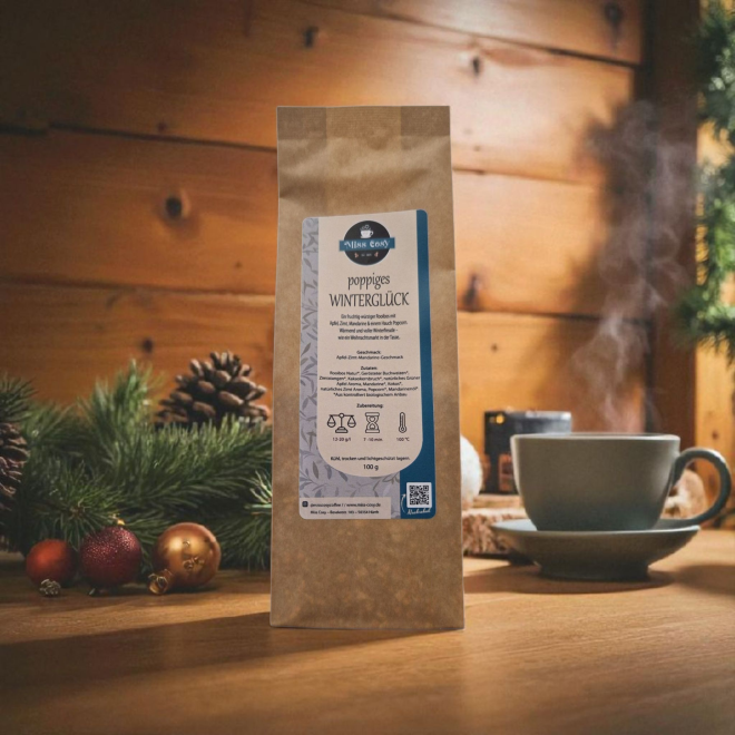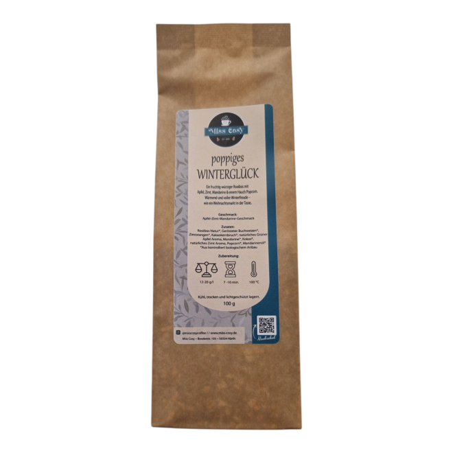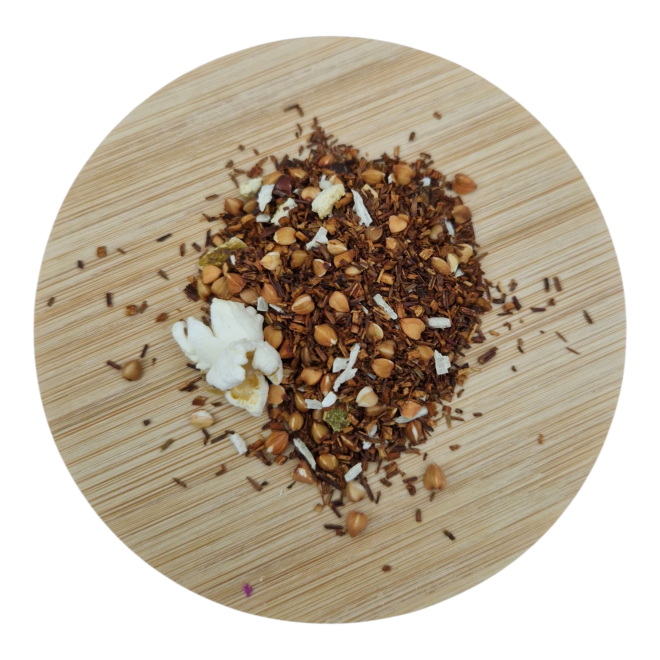 Rooibos und gerösteter Buchweizen schenken eine sanfte Grundlage, Zimt und Kakaokernbruch runden mit wohliger Tiefe ab. Fruchtige Akzente von Apfel und Mandarine treffen auf exotischen Kokos und knuspriges Popcorn – für ein winterliches Genusserlebnis, das zugleich vertraut und verspielt ist.