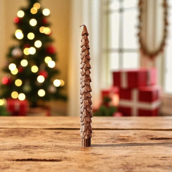 Kupferfarbene Tafelkerze in Form eines Tannenbaums.