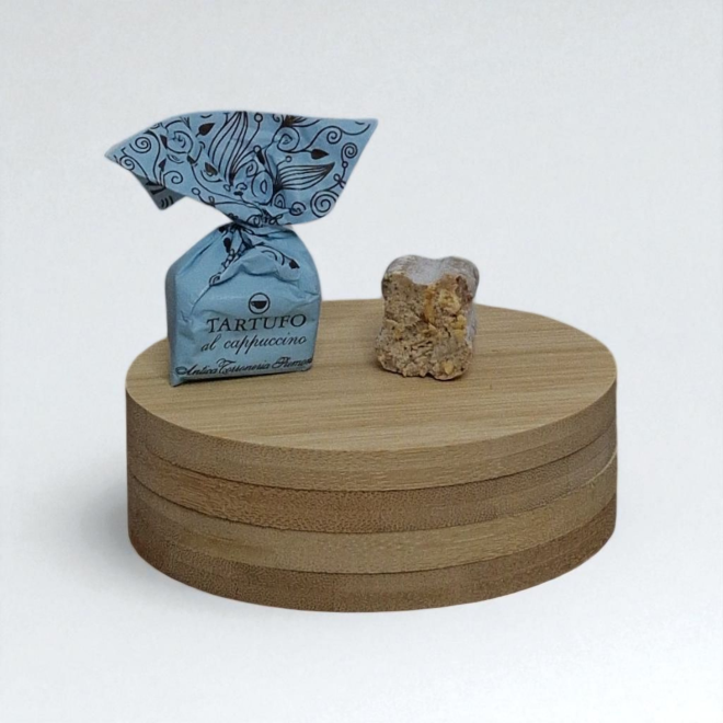 Wie ein süßer Kaffeetraum mit Haselnuss-Sirup: Der Tartufo dolci al Cappuccino vereint die milde Fülle weißer Schokolade mit aromatischem Arabica-Kaffee und dem feinen Crunch piemonteser Haselnüsse. Eine sanfte Vanillenote rundet das Erlebnis ab – cremig, nussig, unwiderstehlich.