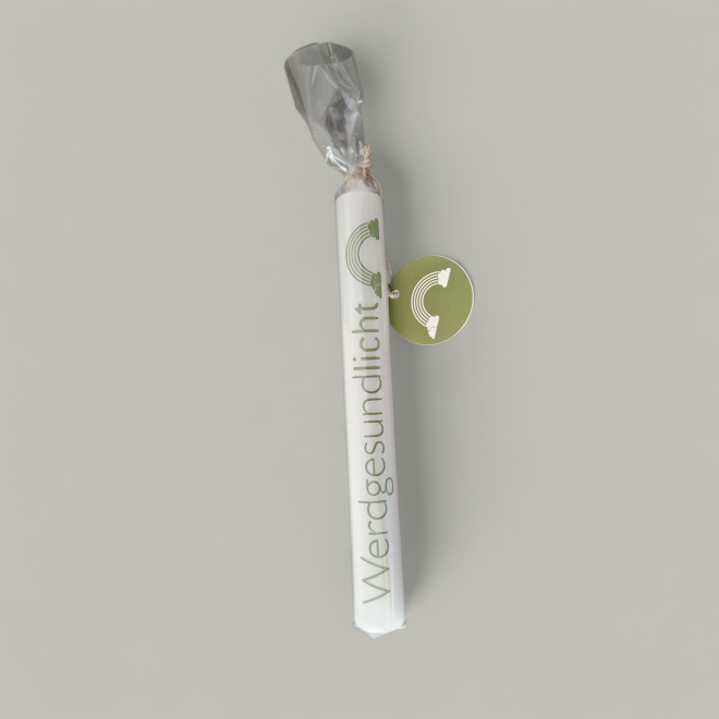 Die in Handarbeit gefertigte Stabkerze trägt ihren Wunsch direkt auf dem Wachs und erinnert daran, dass auch die kleinste Flamme Wärme und Licht bringen kann. Ob als Begleiter im Krankenhaus, als aufmunterndes Mitbringsel oder einfach als stiller Gruß – dieses Licht spendet Trost und positive Energie.